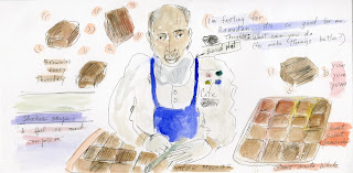 - Anita adds color to a sketch she did of staff in the cafeteria dining room